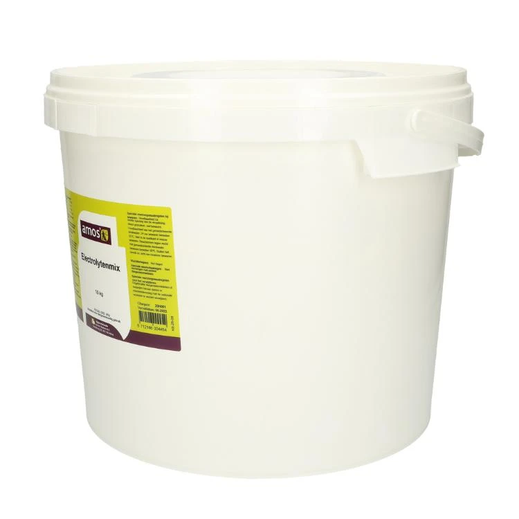 De Amos electrolytenmix wordt geleverd in een hersluitbare emmer van 10 kg, inclusief een maatschepje van 12,5 gram.