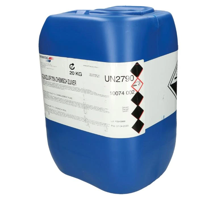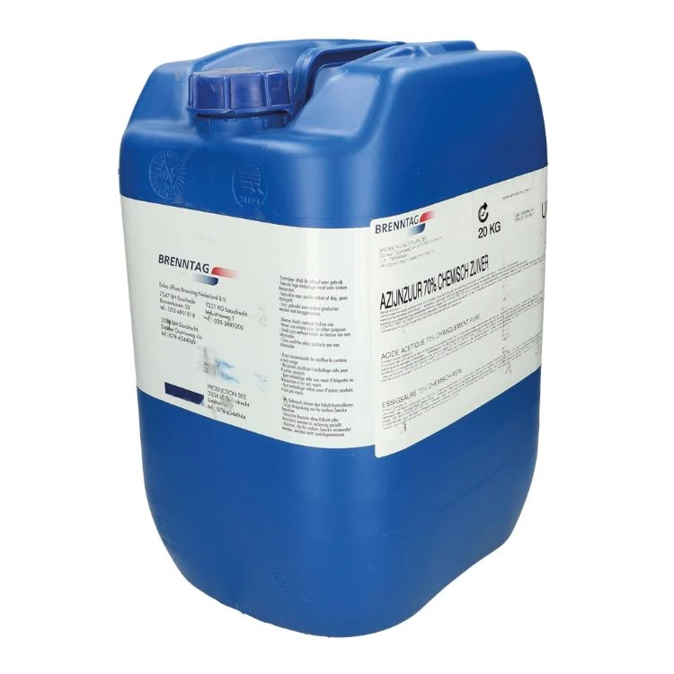 Azijnzuur 70%. Let op: in sommige gevallen wordt er ook gesproken over 65%VOL, dit is identiek aan eengewichtsconcentratie van 70% zoals vermeld in de naam van het product