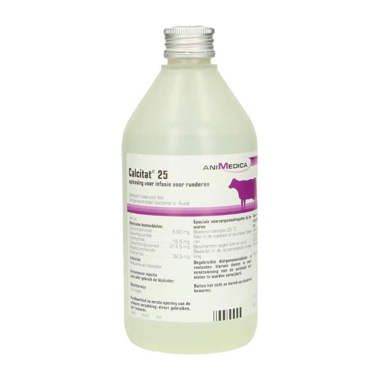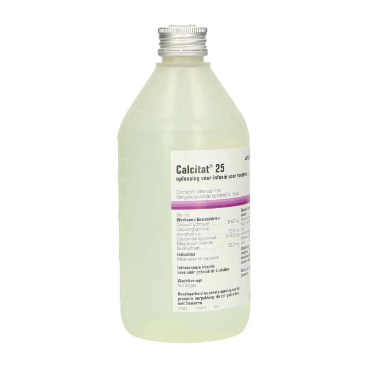 Calcitat 25 is een vloeistof voor de behandeling van melkziekte en kopziekte bij runderen