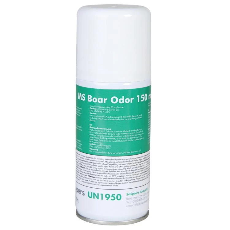 Waarschuwing: Houder onder druk. Beschermen tegen de zon en niet blootstellen aan temperaturen boven 50°C. Ook na gebruik niet doorboren of verbranden. Niet spuiten in de richting van een vlam of een gloeiend voorwerp. Verwijderd houden van ontstekingsbronnen. Alleen voor gebruik bij dieren. Vermijdt sprayen van MS Boar Odor op handen of kleding. Was de handen direct na gebruik en verwissel vervuilde kleding. Inhaleer de spray niet.