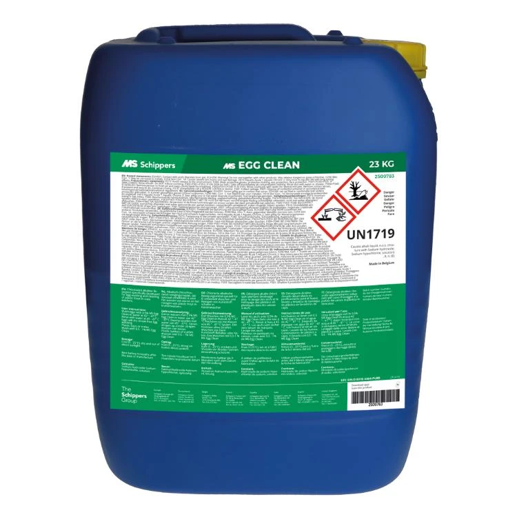 MS Egg Clean is een niet schuimend alkalisch chloorhoudend reinigingsmiddel, speciaal ontwikkeld voor het wassen van eieren en het reinigen van plastic trays in krattenwassers.