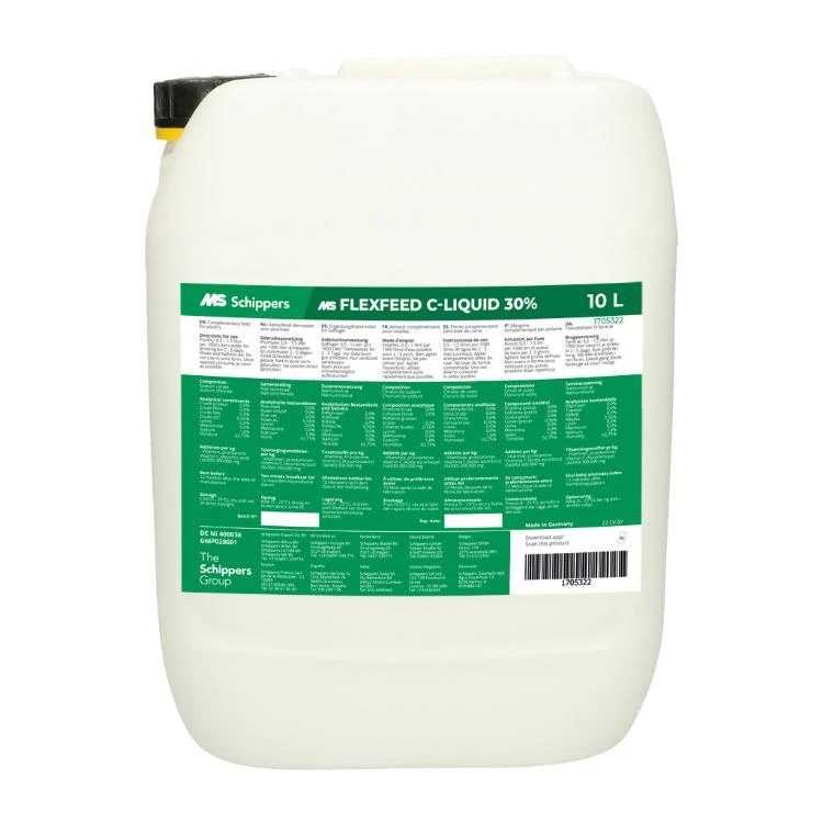 MS Flexfeed C-liquid 30% is een vloeibaar vitamine C mengsel met 300 gram vitamine C per liter voor varkens, pluimvee, kalveren en geiten.
