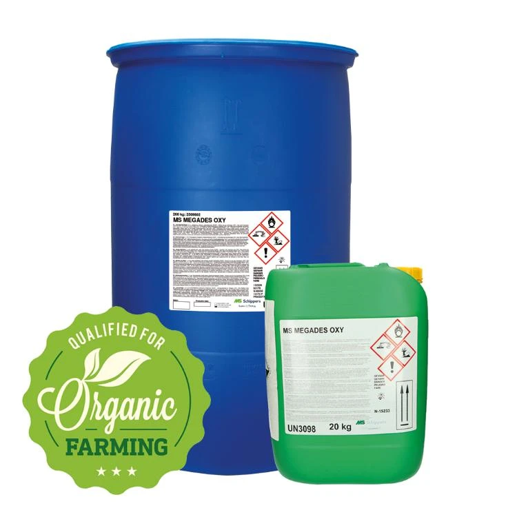 MS MegaDes Oxy is een snelwerkend ontsmettingsmiddel op basis van waterstofperoxide, perazijnzuur en zeer krachtige uitvloeiers. MS MegaDes Oxy mag in de biologische productie worden gebruikt overeenkomstig de Verordeningen (EG) nr. 834/2007 en (EG) nr. 889/2008. MS MegaDes Oxy is ontwikkeld voor gebruik in de varkens-, rundvee- en pluimveehouderij.