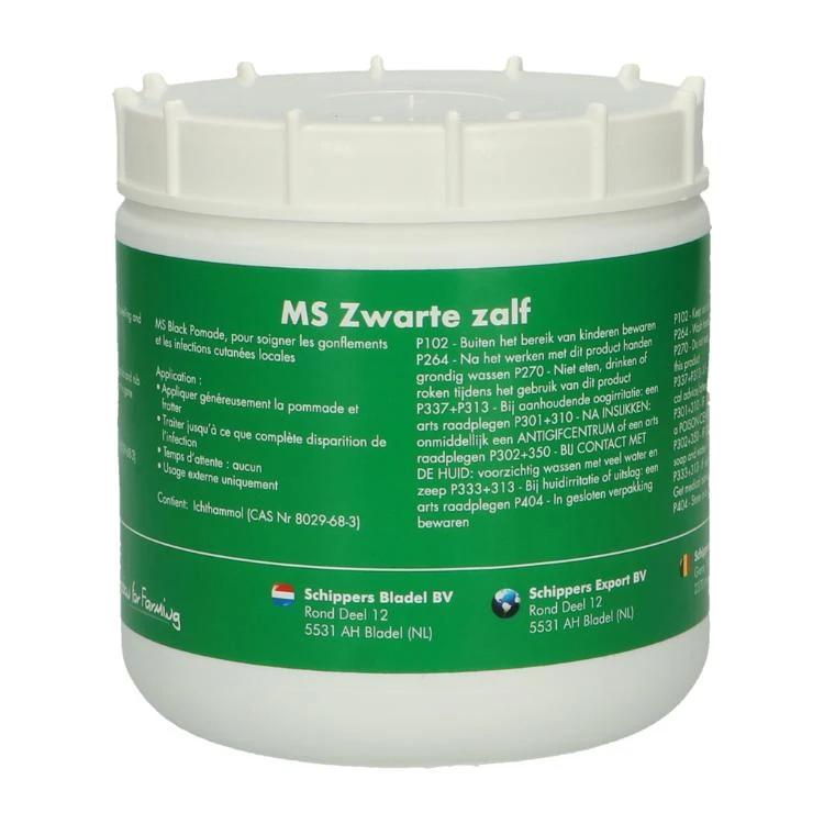 MS Zwarte zalf is een verzorgende zalf voor de behandeling van zwellingen en lokale ontstekingen van de huid bij eenhoevigen en herkauwers.
