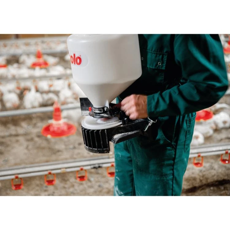 De Solo Graan/tarwestrooier P421 is een handige granulaatstrooier voor het snel een eenvoudig instrooien van vleeskuikenstallen met graan/tarwe.