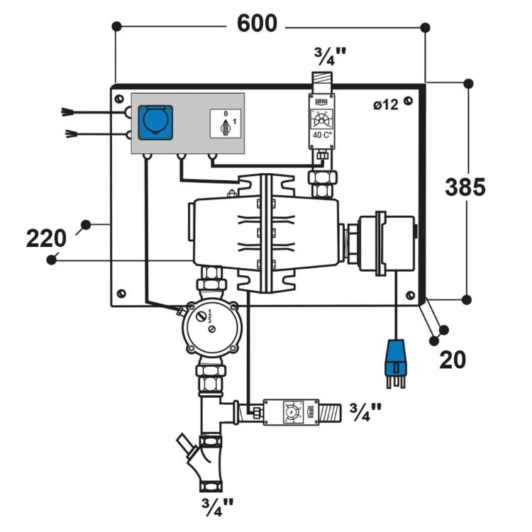 Het systeem wordt compleet geleverd met pomp, verwarmingselement, ontluchtingsventiel, overdrukventiel, terugslagventiel en een terugslagklep.
