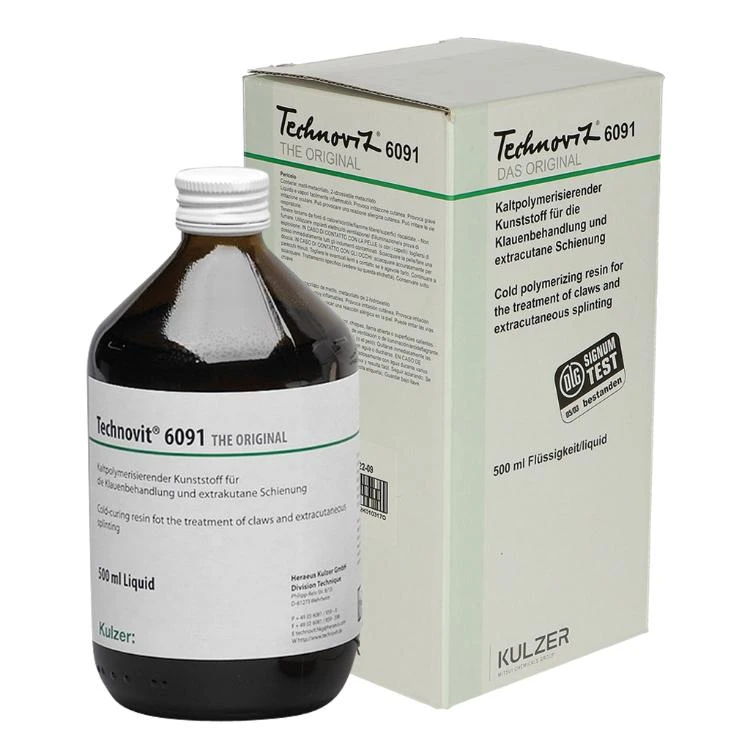 Door de Technovit vloeistof te mengen met het Technovit poeder ontstaat een snelhardende klauwlijm voor het lijmen van klauwblokjes op de klauwen van runderen.