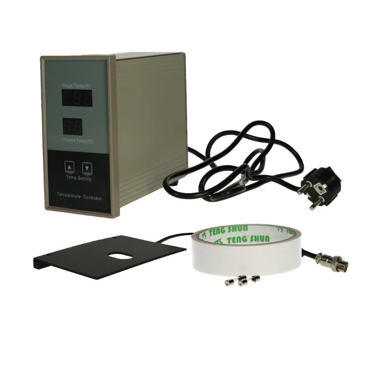 De verwarmde preparaattafel wordt standaard geleverd met stroomkabel en bevestigingsmateriaal (plakband + bouten) voor montage op de kruistafel van de microscoop.