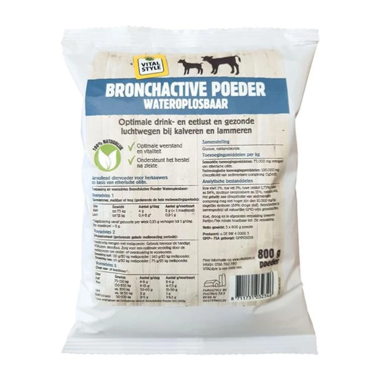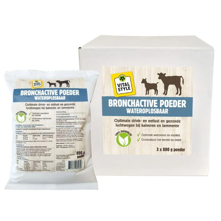 Vitalstyle BronchActive wateroplosbaar poeder is een aanvullend diervoeder voor kalveren en lammeren dat een gezonde functie van de luchtwegen ondersteunt.